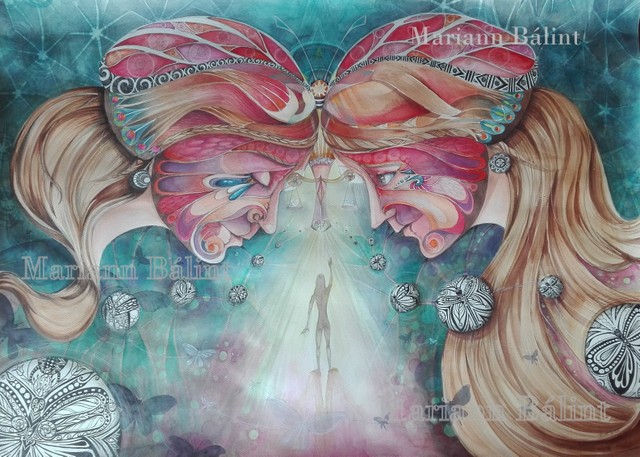 Ha megnézitek ezt a képet, akkor két össze hajoló arcot láthattok, amit álarcként takar egy óriási pillangó. A pillangó egyrészt az átlényegülés szimbóluma, másrészt pedig olyan tünékeny, elrebbenő kis lényecske, ami fátyolként takarja el szemünk elöl a Valóságot. A leela szó azt jelenti, játék-hiszen amikor lényed magjába kerülsz, látod, hogy minden, a történeted, a terápia, a gyógyulás...MINDEN illuzórikus Isteni Színjáték.